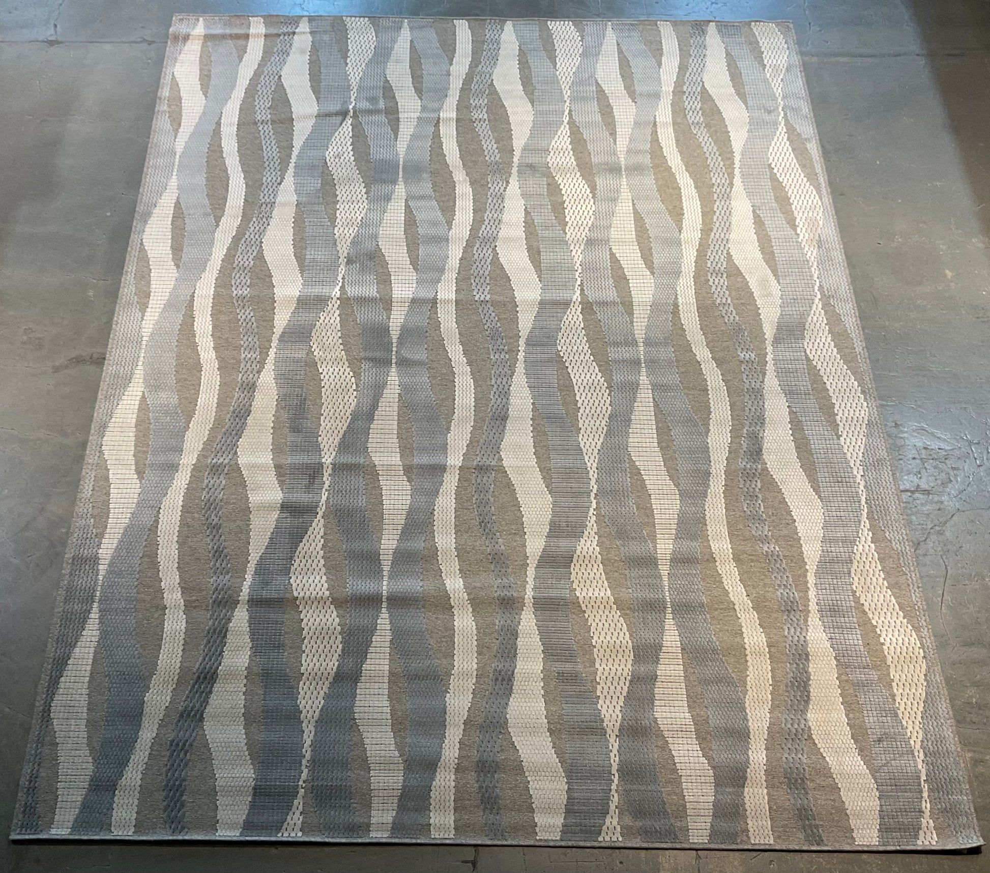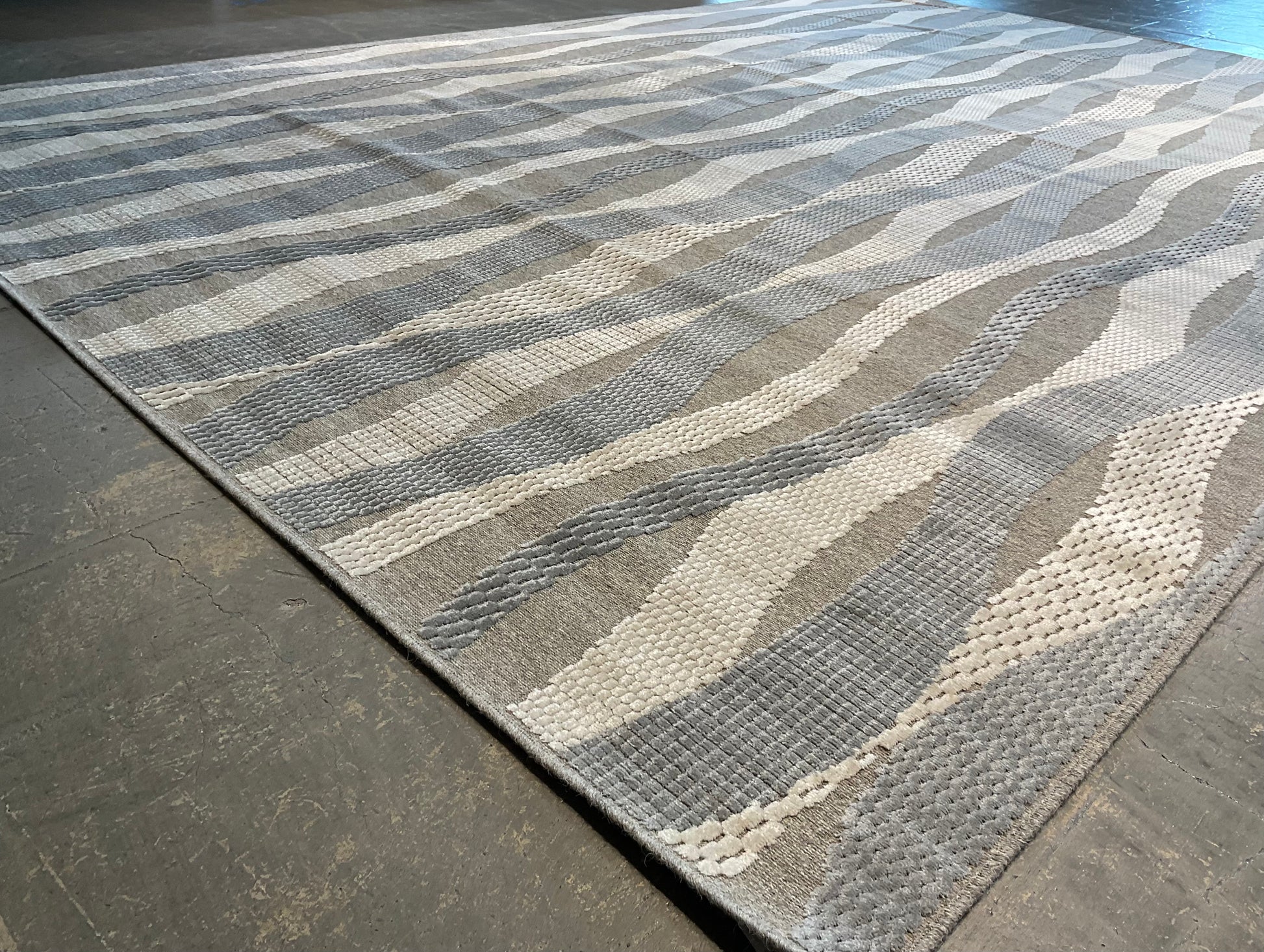 Clean lines and subtle contrast define this three-tone linear rug, crafted from a luxurious blend of wool and bamboo silk. The design features a balanced arrangement of grey, off-white, and beige, offering a calm, structured look with a gentle sheen from the silk.